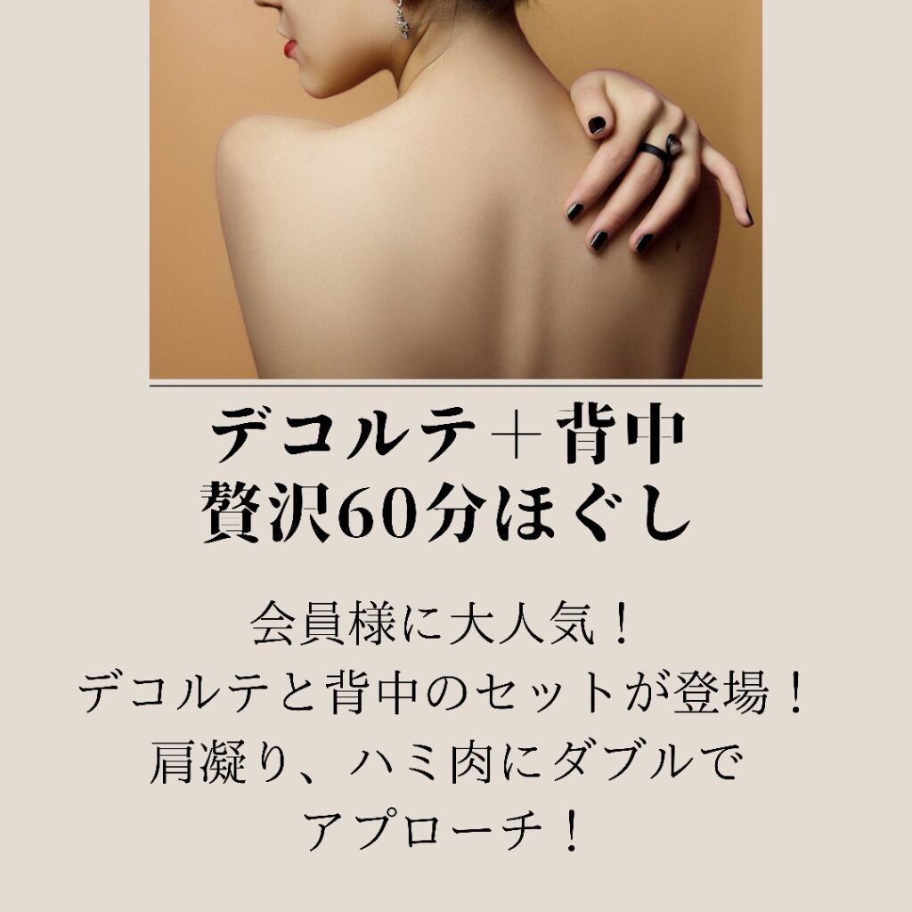 当店の会員様に大人気デコルテと背中のセット!肩こり・背中のハミ肉にダブルでアプローチ!贅沢なひと時をお過ごしください♪